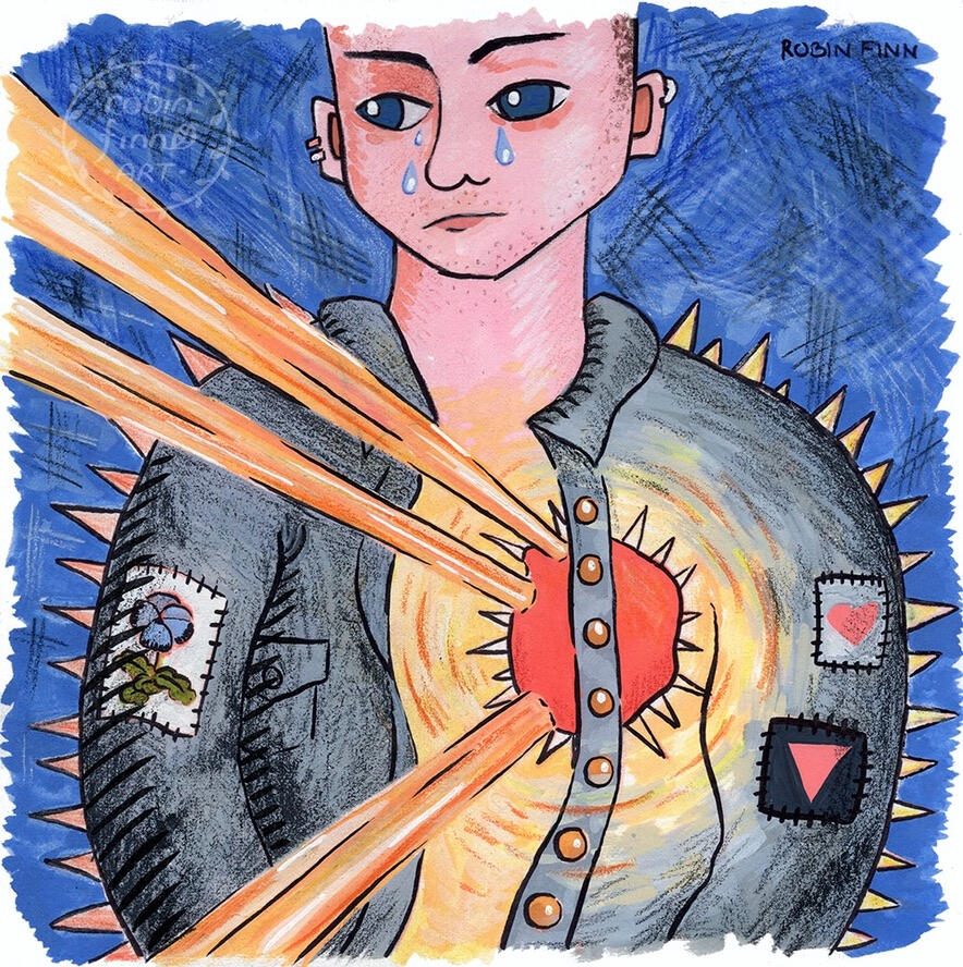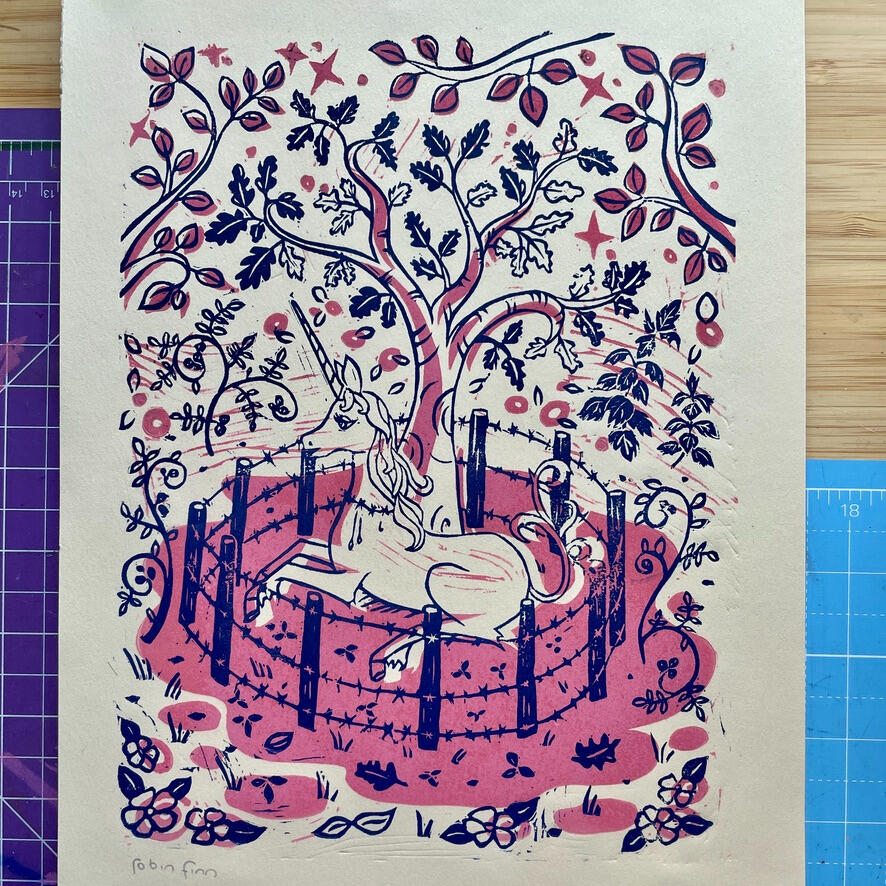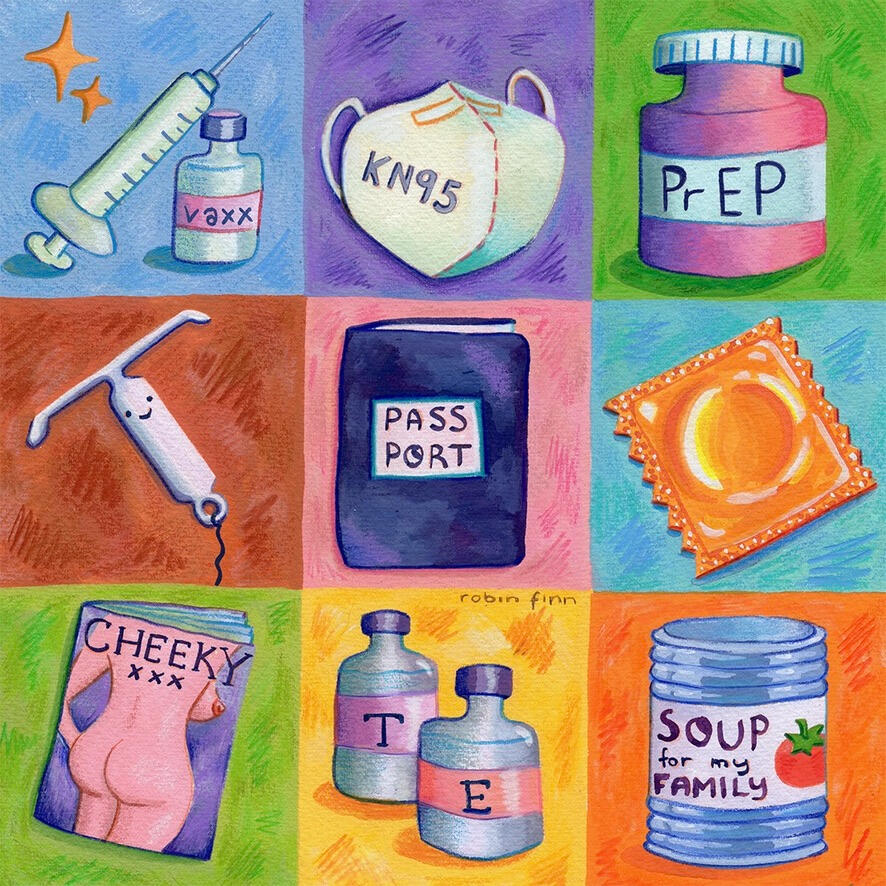 I'm Robin Finn (they/them), a Boston-based mixed media artist and printmaker. My work weaves themes of chronic illness, queer sexuality, and shame with irreverence and whimsy.I sell prints and originals in my shop and run a Patreon with monthly mailed rewards.